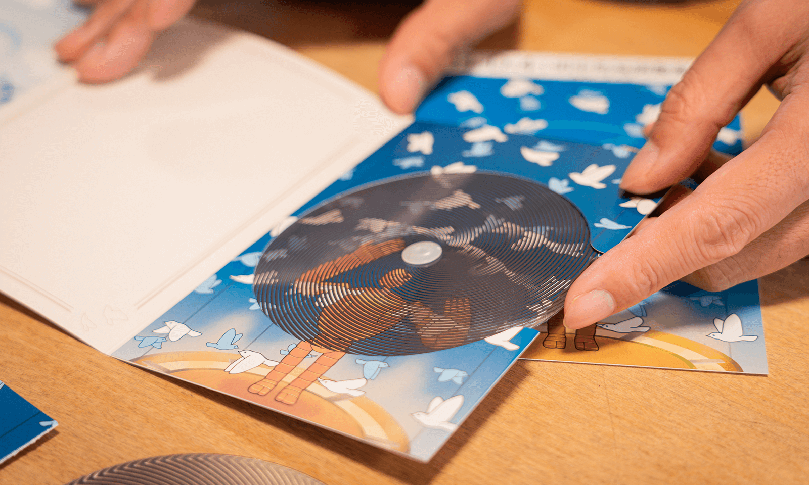 その展示物をモチーフに「スリットアニメーション」という技法を用いて、指で円盤を回すと鳥が飛んでいるように見えるようにしたカードをご紹介します。