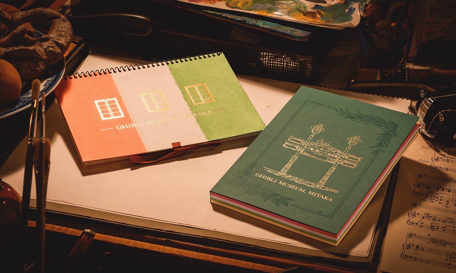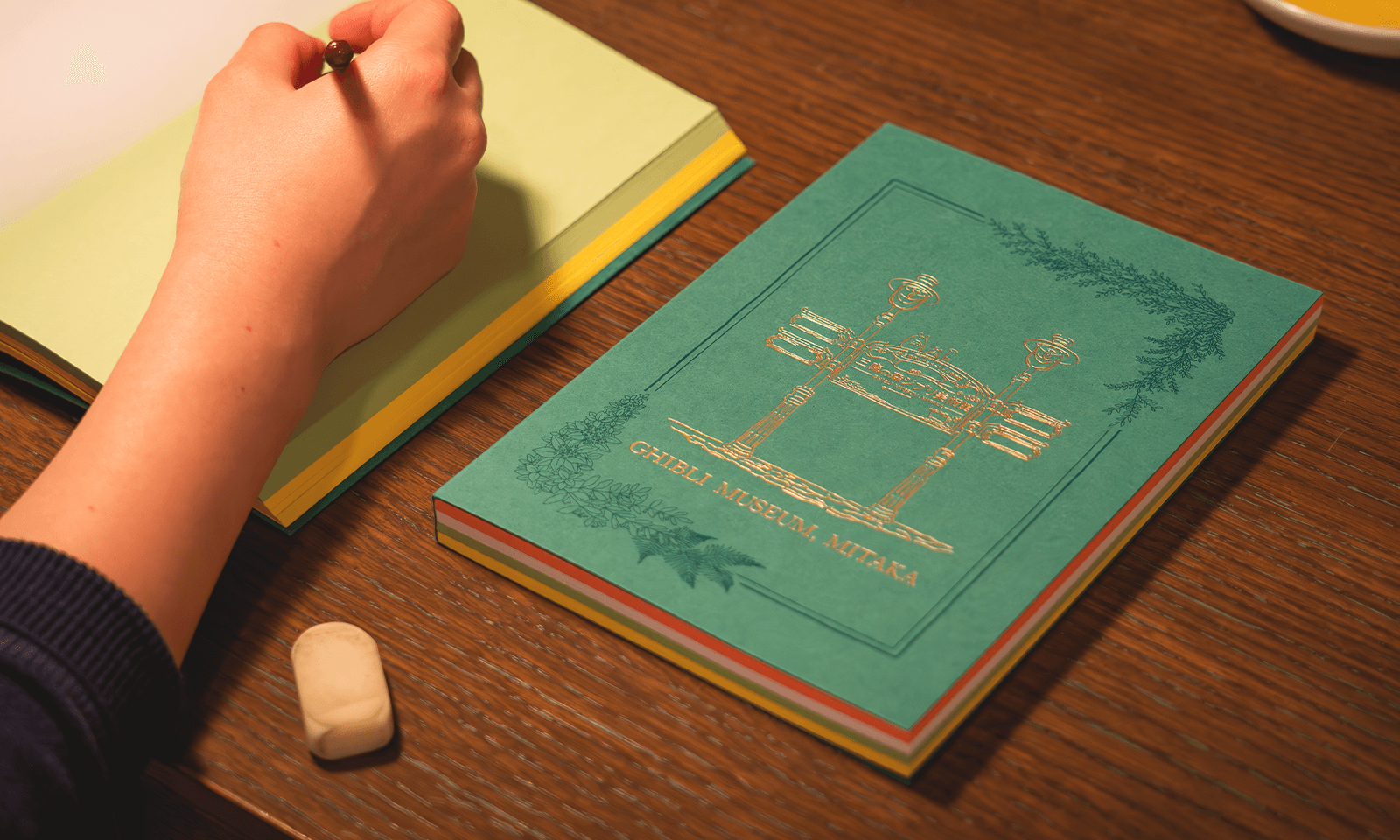 ジブリ美術館の正門にある看板のデザインが、表紙に金色で箔押しされたノート。ページをめくると、美術館のカラフルな外壁をイメージした色とりどりの紙が目を楽しませてくれます。
