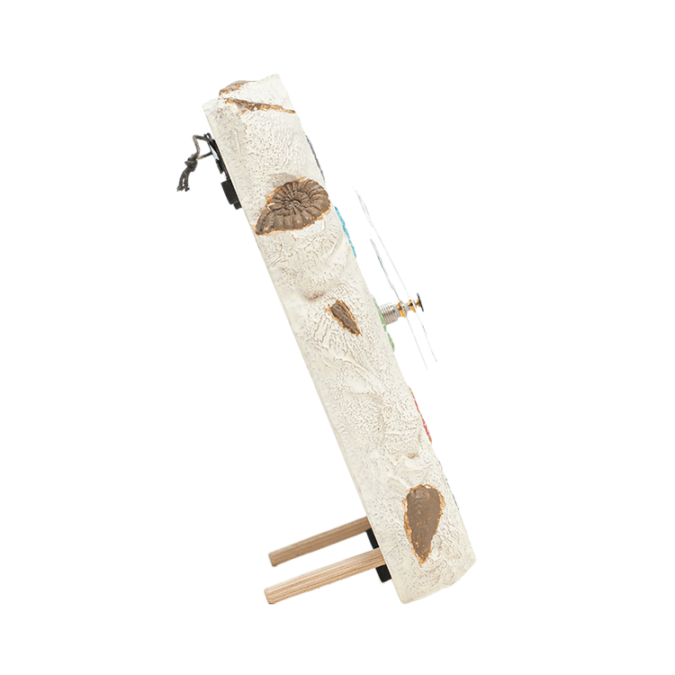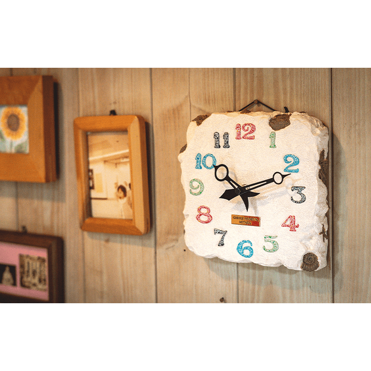 左官壁の質感やモザイクタイルで形づくられた数字、そのぷっくりとしたフォルムも再現した、カラフルでやさしい風合いの時計です。