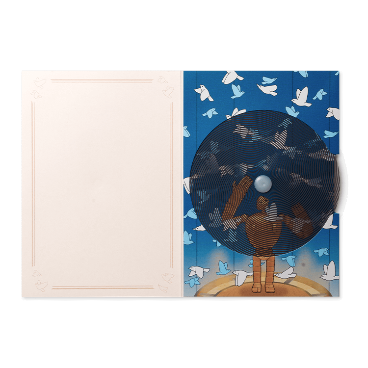 その展示物をモチーフに「スリットアニメーション」という技法を用いて、指で円盤を回すと鳥が飛んでいるように見えるようにしたカードです。
