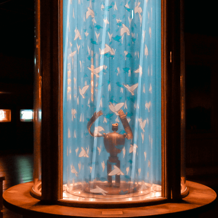展示物「上昇海流」は、回転する黒いスリット筒の内側に、羽ばたく鳥が描かれている2重の透明なアクリル筒が仕込まれています。3つの筒を同時に回転させると、外側の黒いスリット筒は高速回転と内側の強い光源のために見えなくなり、ロボット兵の周りを鳥が舞い上がっていくように見えます。