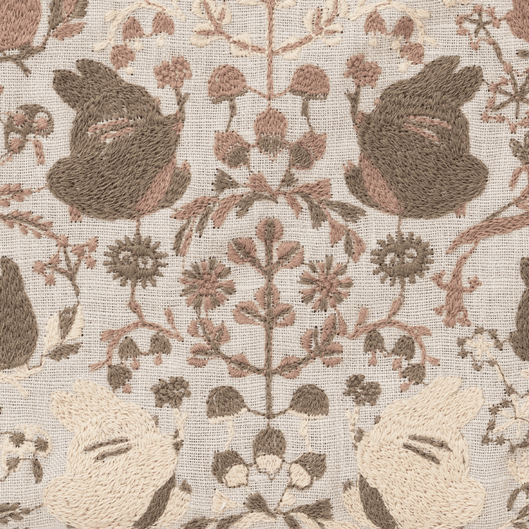 刺繡で表現されるトトロの毛の流れや、植物の風合いが自然体になるよう、デザインの段階から細部まで考えられています。