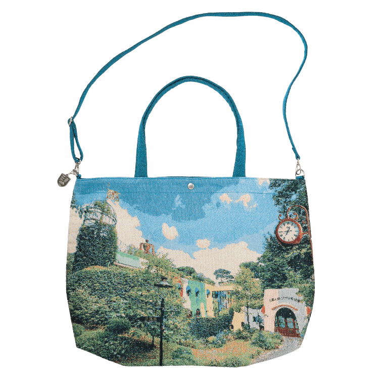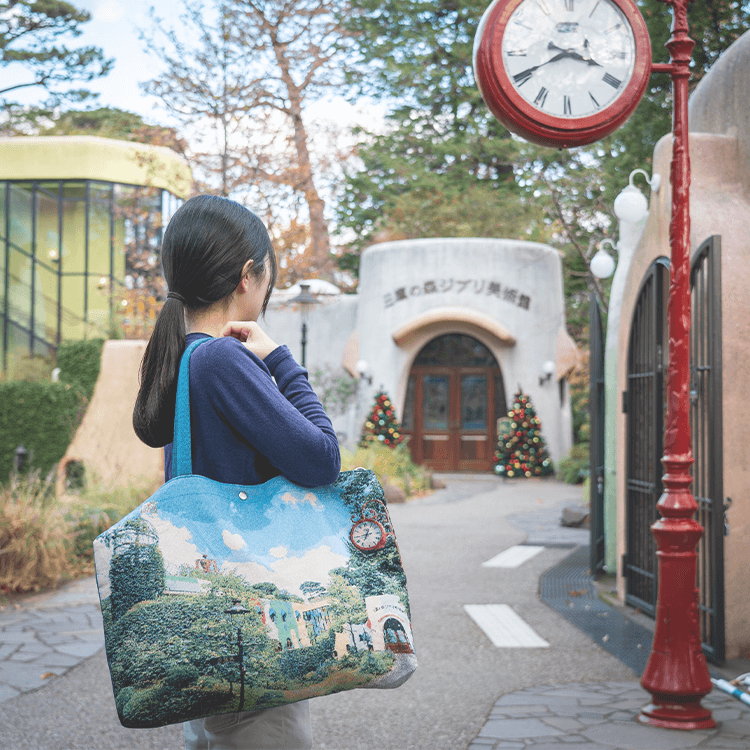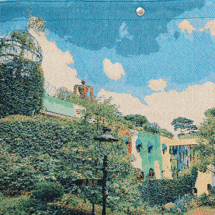 ジブリ美術館の全景をモチーフにつくられたジャガード織生地のバックです。